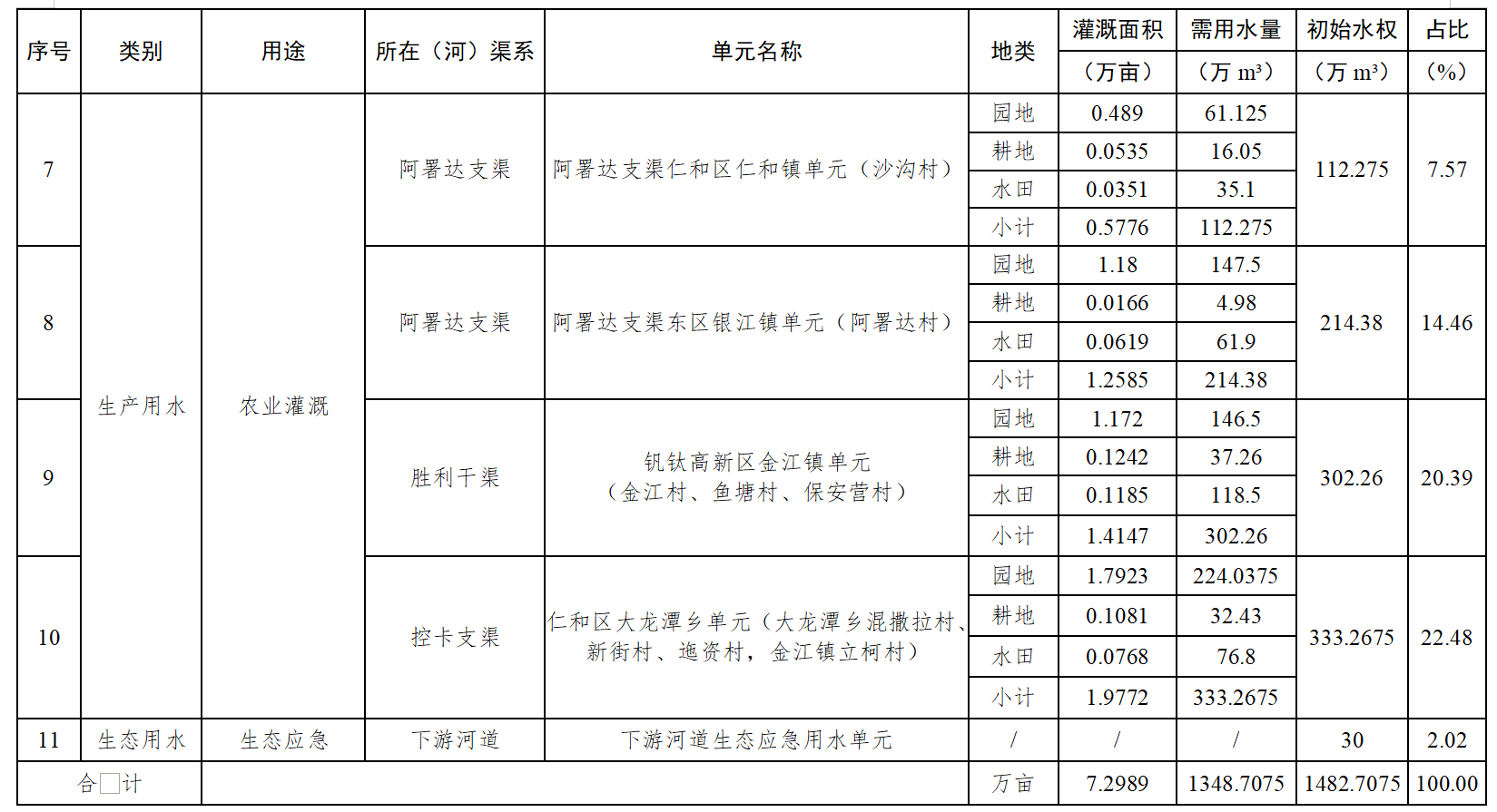 2.分配水權。初始水權分配,按照“3類5序11片”(3類:即3種供水行業類型,分別是城市應急供水水權,農村生活供水水權,農業灌溉用水。5序:即5個供水先后順序,1序保城市應急供水,2序供農村生活用水,3序供農業生產用水,4序生態應急調水,5序富裕水量供城市生活用水。11片:即生活應急保障片區、農村人飲片區、城鎮生活片區、大田鎮片區、仁和鎮西大溝片區、仁和鎮勝利干渠片區、沙溝村片區、阿署達村片區、金江鎮片區、大龍潭鄉片區、生態應急片區。)的用水原則,綜合考慮各用水單元功能定位、產業結構、灌溉面積等因素,將初始水權分配到灌區11個用水單元。單元內水權分配,各用水單元管理主體根據實際情況采用“一事一議”方式完成二次分配。