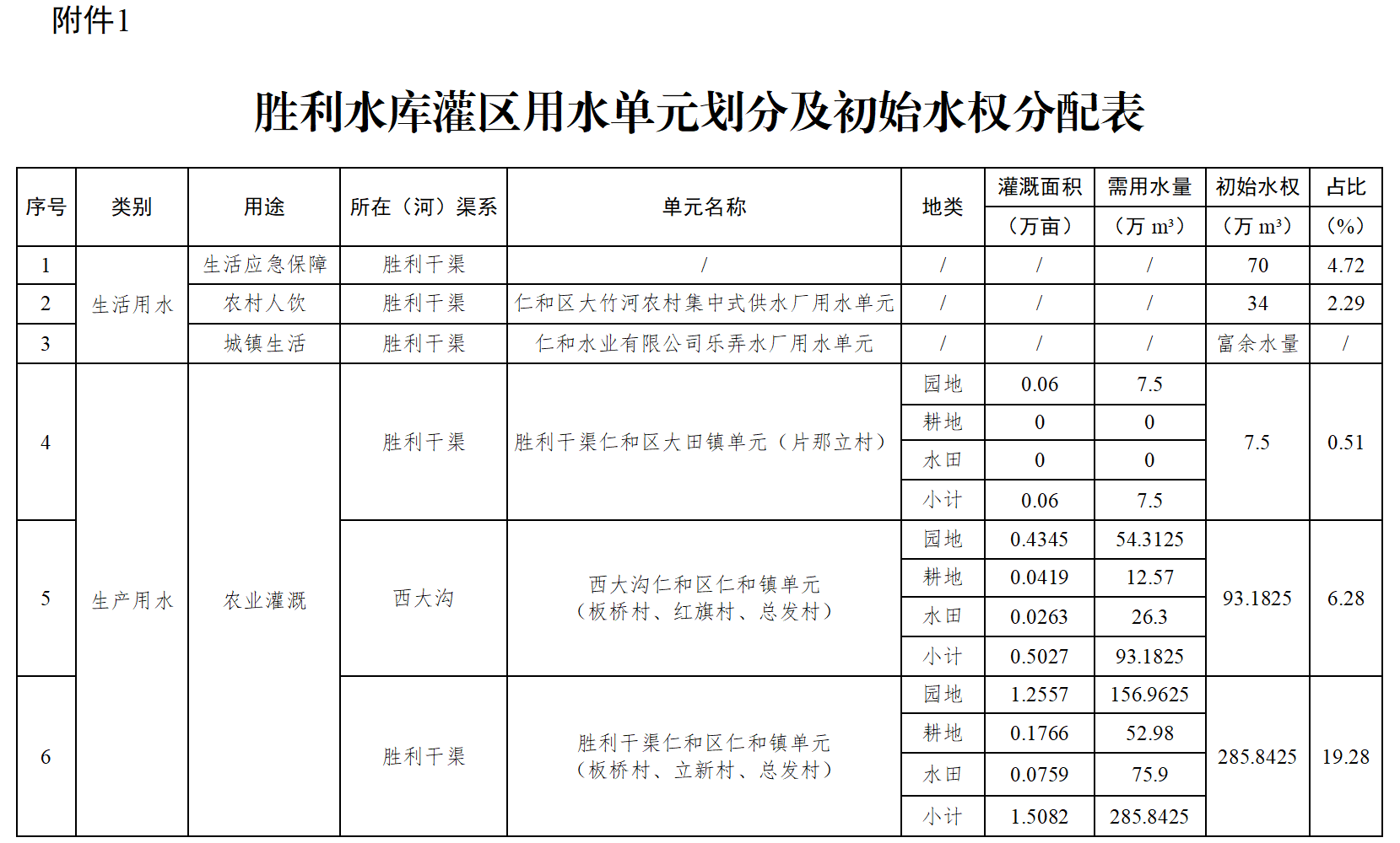 附件:1.勝利水庫灌區用水單元劃分及初始水權分配表