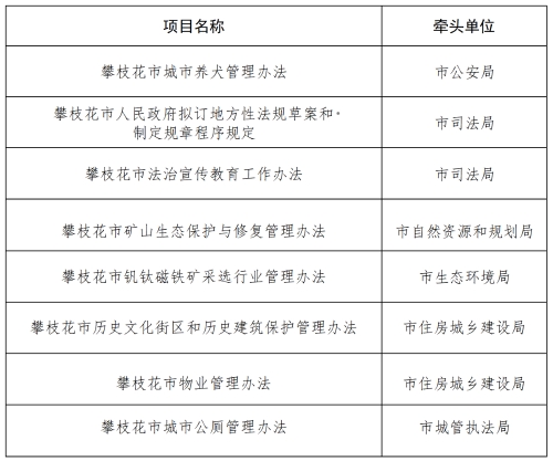 根據我市經濟社會發展需要,結合有關工作安排,經過廣 泛征求意見、深入研究論證,編制了《攀枝花市政府規章立法 規劃(2022 —2026 年)及 2022 年政府立法計劃》。納入政府規 章五年規劃的立法項目,后期還將根據實際工作需要,進行年 度立法計劃項目論證,待時機成熟后,經報請市委同意,方能 納入次年的年度立法計劃。請各有關部門(單位)堅持科學立 法、 民主立法、依法立法原則,加強立法工作組織協調,充分 發揮行政立法在推進城市治理體系和治理能力現代化中的作 用,突出攀枝花特色,為加快現代化區域中心城市建設提供有 力法治保障。 市政府規章立法規劃(2022 —2026 年)及 2022年政府立法計劃具體項目如下:
