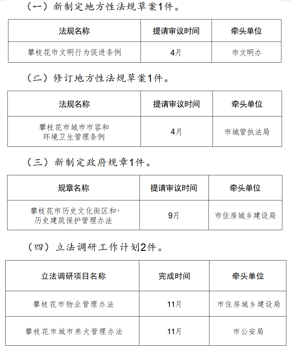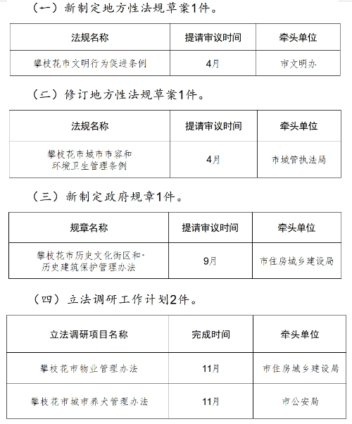 一、攀枝花市政府規章立法規劃(2022 —2026 年)
