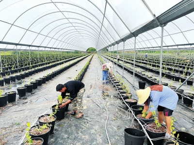 藍莓大棚內,園丁們正在精心管理栽種的新苗。