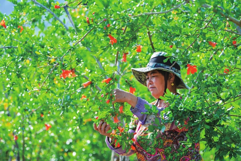 大田鎮種植石榴15000余畝,年產量約6000萬斤,年產值近2.3億元,全鎮農民農業收入近70%都來源于石榴產業,石榴已經變成了村民們的“金果果”。大田鎮依托石榴產業,開發出了“石榴+康養+旅游”的發展模式,逐步形成“賞石榴花、摘石榴果、吃石榴雞、喝石榴酒”的產業鏈條,并通過舉辦石榴花節、石榴節、“網絡石榴節”等 活動,讓石榴花綻放“鄉村振興”之路。(孔令琪 記者 王南楨)