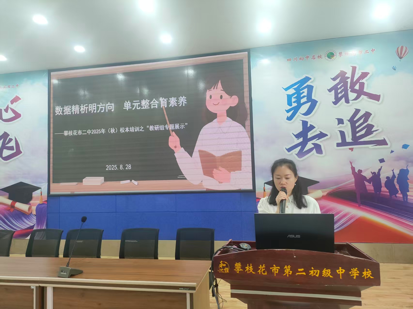 未覺三夏盡,時序已新秋。伴隨著季節的更迭,我們共同迎來了充滿希望與挑戰的新學期。8月28日,攀枝花市第二初級中學校全體教師齊聚一堂,參加2025年(秋)校本培訓之“教研組專題展示”活動,活動由科研師培科負責人趙穎主持。
