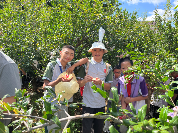 活動伊始,兩校舉行結對儀式,特校學生與大田鎮中心學校學生組成協作小組。緊接著,手語老師楊盛強開啟手語教學,教授“石榴”“采摘”“天氣”“很熱”“我們”等實用手語詞匯,特校學生則主動當起“小老師”,幫助結對伙伴糾正動作,氛圍在互動教學中逐漸升溫,有效打破了溝通壁壘,讓普特學生快速拉近了距離。隨后,協作采摘環節正式開啟。各小組進入指定區域,分工協作:普校學生幫聾生伙伴指出成熟飽滿的石榴,用剛學會的手語進行交流。教師們巡回指導,及時提供支持與安全保障,田間地頭滿是忙碌又溫馨的身影,勞動的汗水與收獲的笑容相映趣。