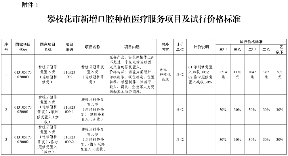 附件:1.攀枝花市新增口腔種植醫療服務項目及試行價格標準