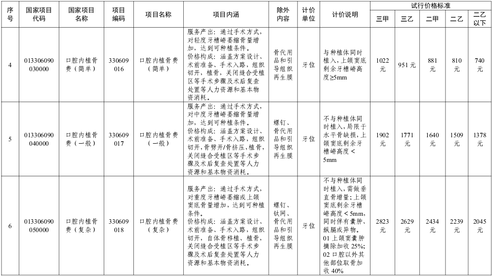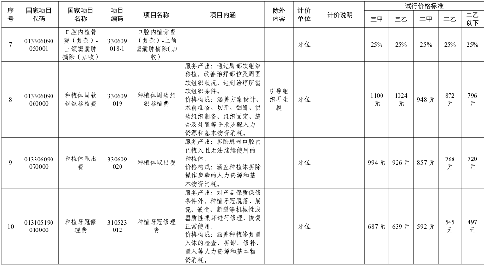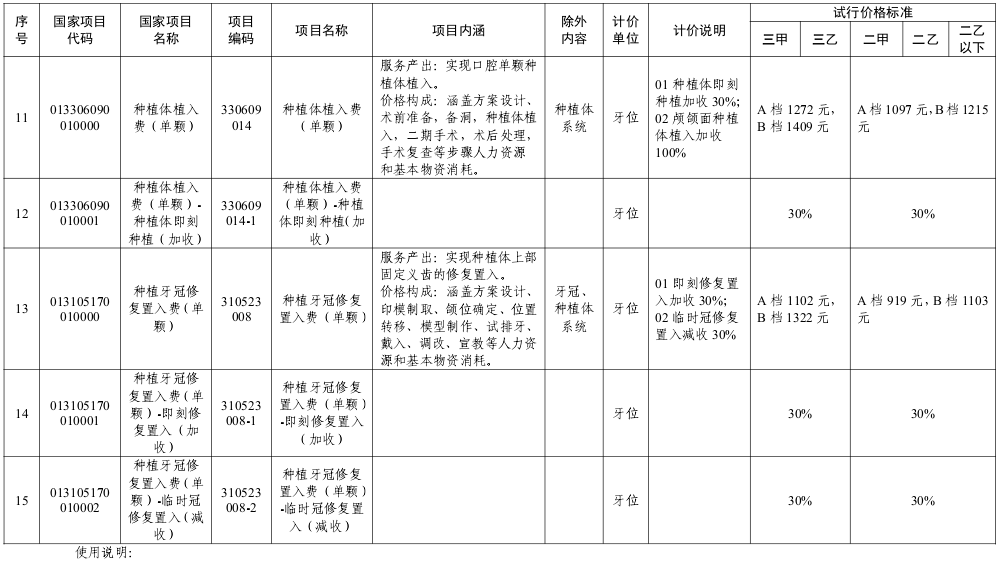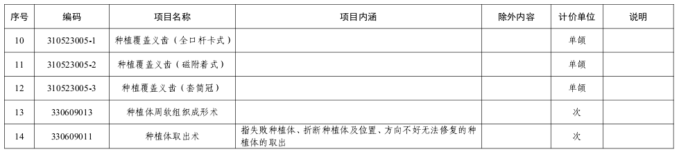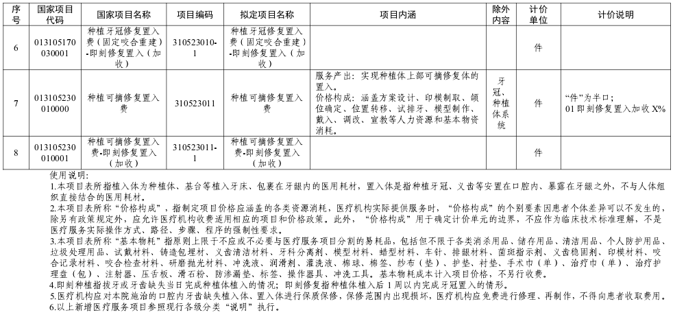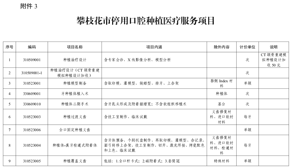 三、停用“種植治療設計”等14項口腔種植醫療服務項目(詳見附件3)。現有其他口腔類醫療服務項目的項目內涵,若已包含在23項新增口腔種植醫療服務項目內涵里的,在開展口腔種植醫療服務時相關項目不再與上述23個項目同時計費。