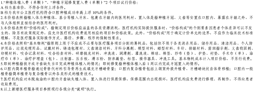 一、新增“種植體植入費(單顆)”等15項實行政府指導價管理項目,各公立醫療機構嚴格按照公布的試行價格標準執行(詳見附件1)。