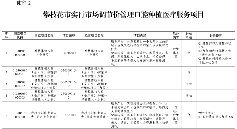 2.攀枝花市實行市場調節價管理口腔種植醫療服務項目