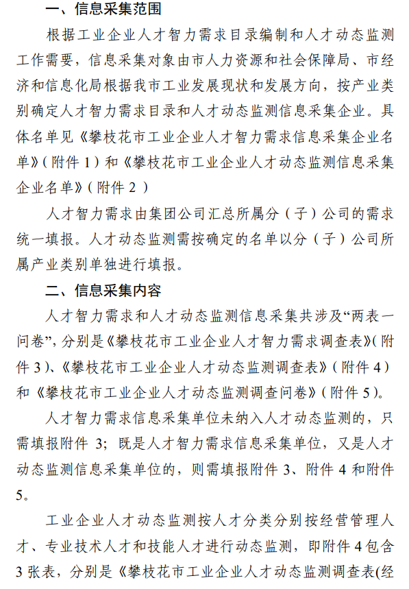 為切實加強工業經濟領域人才隊伍建設,著力引進和培養釩鈦等工業領域高端人才,為攀枝花工業轉型升級、科技創新、智慧發展提供人才和智力支撐,根據《中共攀枝花市委辦公室 攀枝花市人民政府辦公室關于印發<進一步加強人才工作服務工業經濟發展的措施>的通知》(攀委辦〔2018〕73號)和《攀枝花市人力資源和社會保障局 攀枝花市經濟和信息化委員會關于印發<貫徹落實<進一步加強人才工作服務工業經濟發展的措施>工作計劃>的通知》(攀人社發〔2018〕517號)精神,現就做好人才智力需求目錄編制和人才動態監測有關工作通知如下: