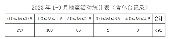 2023年1-9月地震監測情況
