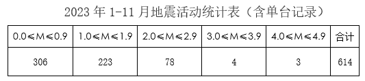 2023年1-11月地震活動(dòng)統(tǒng)計(jì)表及多臺(tái)定位震中分布圖如下所示: