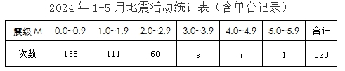 2024年1-5月地震活動統計表及多臺定位震中分布圖如下所示: