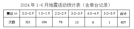 2024年1-6月地震活動統計表及多臺定位震中分布圖如下所示: