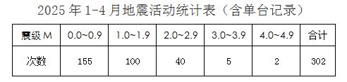 2025年1-4月地震活動統計表及多臺定位震中分布圖如下所示: