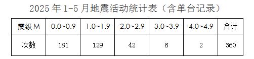 2025年1-5月地震活動統計表及多臺定位震中分布圖如下所示: