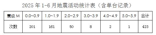 2025年1-6月地震活動統計表及多臺定位震中分布圖如下所示: