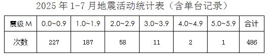 2025年1-7月地震活動統計表及多臺定位震中分布圖如下所示:
