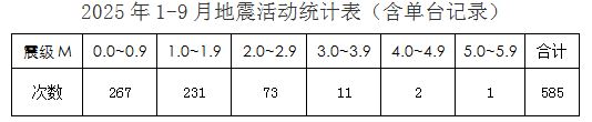 2025年1-9月地震活動統計表及多臺定位震中分布圖如下所示: