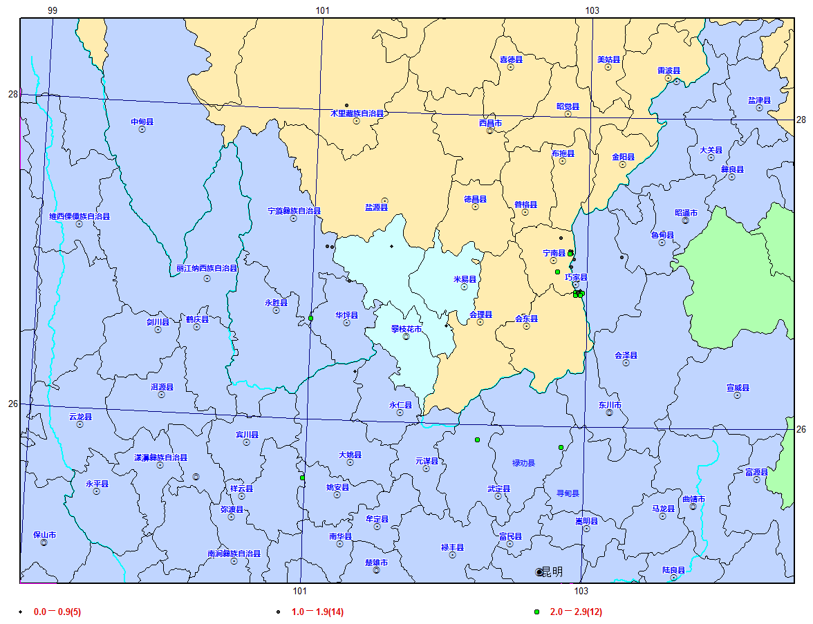 本月責任區共監測到2次地震,分別發生在鹽邊縣紅寶鄉和新九鎮,其中最大地震為3月11日09時19分鹽邊縣新九鎮0.7級,震源深度10公里,震中距離我市中心約30公里。