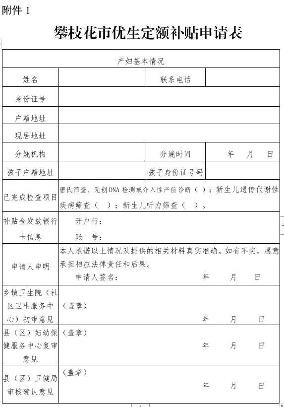 (一)《攀枝花市優生定額補貼申請表》(附件1)。
