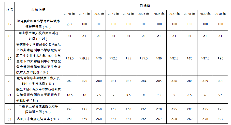 到2030年,人均預(yù)期壽命達到80歲,孕產(chǎn)婦死亡率控制在9/10萬以內(nèi),嬰兒死亡率控制在4.5‰以內(nèi),5歲以下兒童死亡率控制在6‰以內(nèi),居民健康素養(yǎng)水平達到30%以上,城鄉(xiāng)居民達到《國民體質(zhì)測定標準》合格以上人數(shù)比例達93%以上。