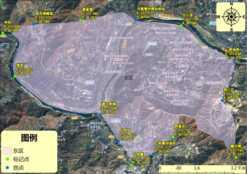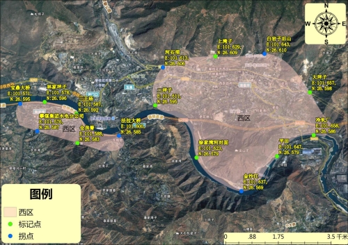 清香坪至大水井片區:東起涼風坳隧道(E:101.670,N:26.589)西端,南臨金沙江(E:101.637,N:26.569),西至河石壩片區(E:101.613,N:26.606),北靠白巖子后山(E:101.643,N:26.610)。