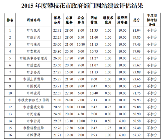 在2015年度攀枝花市政府部門網(wǎng)站績效評估結(jié)果中排名第16位(納入評估的市級部門共45個(gè)),如下圖所示: