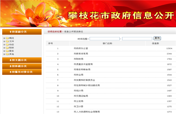 2016年在政府信息公開工作方面主要存在以下問題:信息公開的內容和時效有待進一步完善、提升。為改進之前存在的問題,我局已安排專人及時上傳應公開信息,信息公開工作效果明顯。在攀枝花市公眾信息網站的信息報送排名已從之前的24名上升為21名,如圖所示: