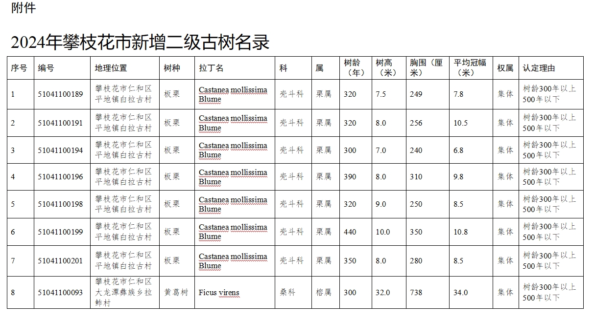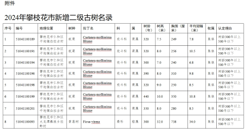 攀枝花市人民政府關于公布2024年攀枝花市新增二級古樹名錄的通告