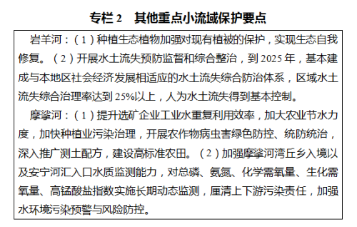 (二)大河流域。完善城區污水處理配套管網建設,以大河中路片區、仁和鎮壇罐窯片區等區域為重點,強化仁和老舊城區雨污分流管網改造,持續深化農村污水綜合治理,推進河道水質改善。有效保障大河生態流量,實施大河流域補水項目,開展灌區、城區生態河道整治和水域生態修復,推廣節水灌溉技術,提升農業灌溉水有效利用系數;探索區域再生水回用試點,在流域范圍內推廣再生水循環利用技術,建設再生水循環利用體系,提高水資源利用效率。