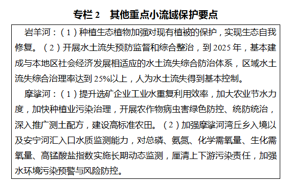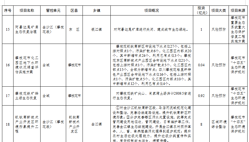 強化水環境風險源管控,推進全攀工業園區、尾礦庫、排土場等重點風險源監管力度,實施礦區生態治理。著力提升水環境風險預警、應急處置能力,筑牢水環境風險安全保護屏障。