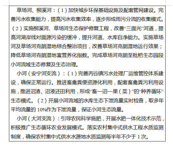 (三)楠木河流域。推進農業節水,通過渠系改造、灌溉制度改進、耕作方法改變、節水灌溉推廣等節水措施,提升渠系水平均利用率以及灌溉水平均利用率。持續推進鄉鎮生活污水處理設施建設。進一步完善生活垃圾收運系統,提高生活垃圾收集率、處理率。加快生態修復區綜合治理,堅持“綜合治理、因地制宜”,在楠木河流域農業人口密集,水土流失嚴重地區進行水土流失綜合治理,明確中山保土人居環境生態維護區、低中山保土保水減災區、中山水源涵養生態維護區整治任務。