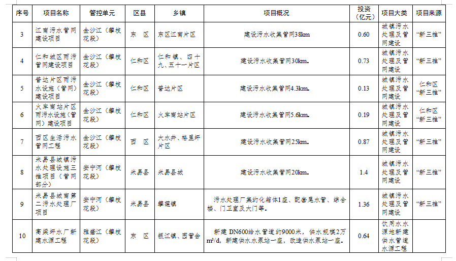 推進污水處理設施建設。嚴格釩鈦高新技術產業開發區、東區高新技術產業園區、格里坪特色產業園區、南山循環經濟開發區排污許可,強化智慧污水處理設施建設。推進全市雨污分流改造工作,以市主城區排水管網排查檢測項目為依托,對城市建成區范圍內的雨污管網進行分流,有效提高污水收集效能。