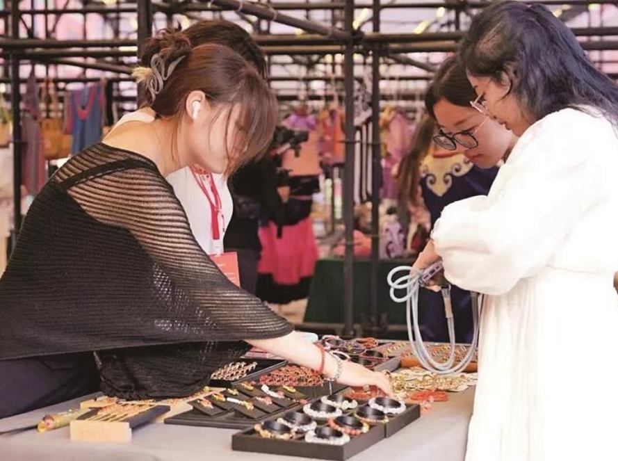 產品市集上,極具民族特色的服飾、飾品、包具等吸引游客購買。