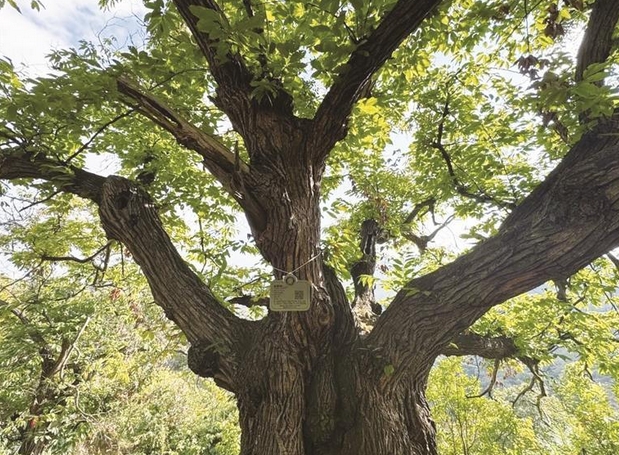 在白拉古村黨總支副書記徐友和的帶領(lǐng)下,我們穿過一段硬化道路和棧道,來到了板栗古樹群公園的核心區(qū),從外圍到核心區(qū)直線距離不到200米,但道路竟蜿蜒了900余米,漫步其中可聽風(fēng)觀林,風(fēng)景別致匠心獨(dú)具。
