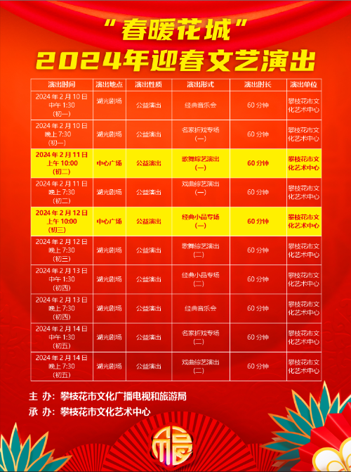 為營造歡樂、祥和的節慶氛圍,滿足人民群眾精神文化需求。由攀枝花市文化廣播電視和旅游局主辦,攀枝花市文化藝術中心承演的“春暖花城”2024年迎新春文藝演出將于2024年2月10日(正月初一)至2024年2月14日(正月初五)分別在中心廣場、湖光劇場舉辦。