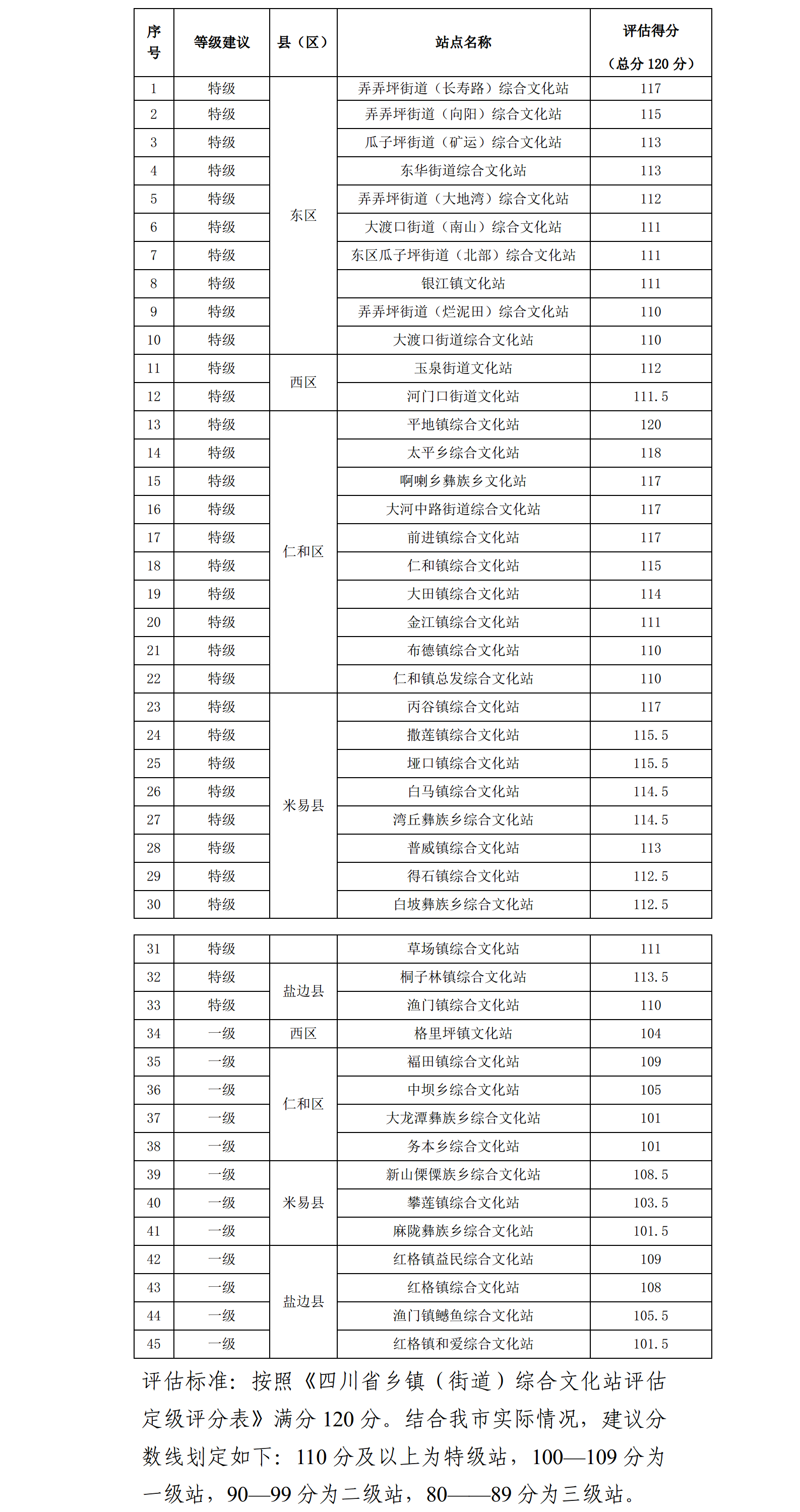 攀枝花市文化廣播電視和旅游局關于擬推薦攀枝花市鄉鎮(街道)綜合文化站評估定級等級名單建議的公示