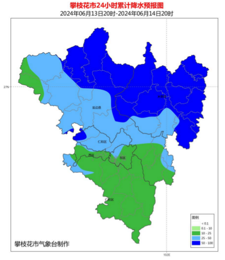 攀枝花市氣象臺06月13 日16 時00分發布暴雨藍色預警:預計今天晚上到明天白天我市米易縣大部、鹽邊縣北部將有一次暴雨天氣過程,大部地區雨量 40—60 毫米,過程最大小時雨量30—40 毫米。市區中雨,局部大雨,仁和區中雨,局部大到暴雨。過程中可能伴有雷電、大風等強對流天氣,請注意防范。