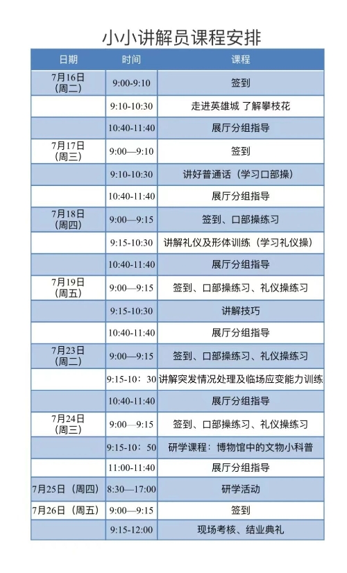 對通過面試的35名小小講解員進(jìn)行為期2周的專業(yè)培訓(xùn)。