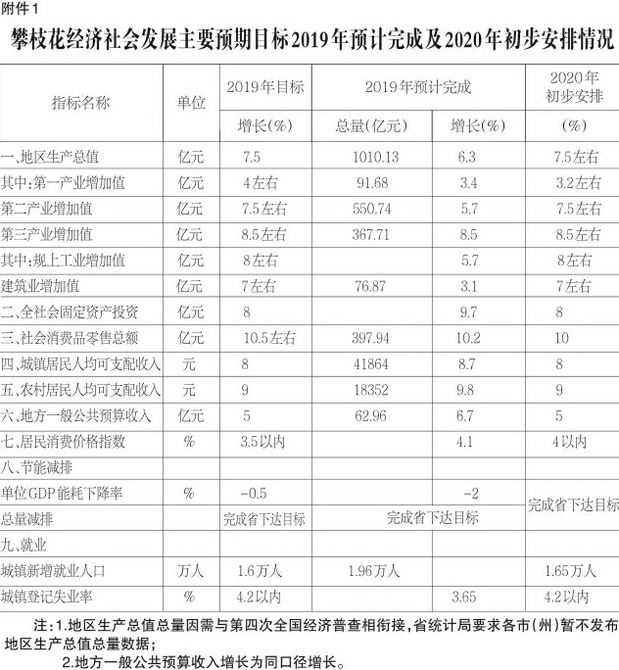 附件:1.攀枝花經濟社會發展主要預期目標2019年預計完成及2020年初步安排情況