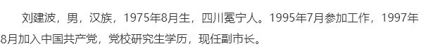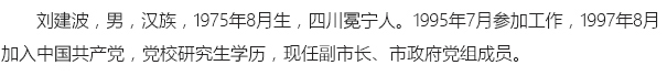 劉建波,男,漢族,1975年8月生,四川冕寧人。1995年7月參加工作,1997年8月加入中國共產黨,黨校研究生學歷,現任副市長。