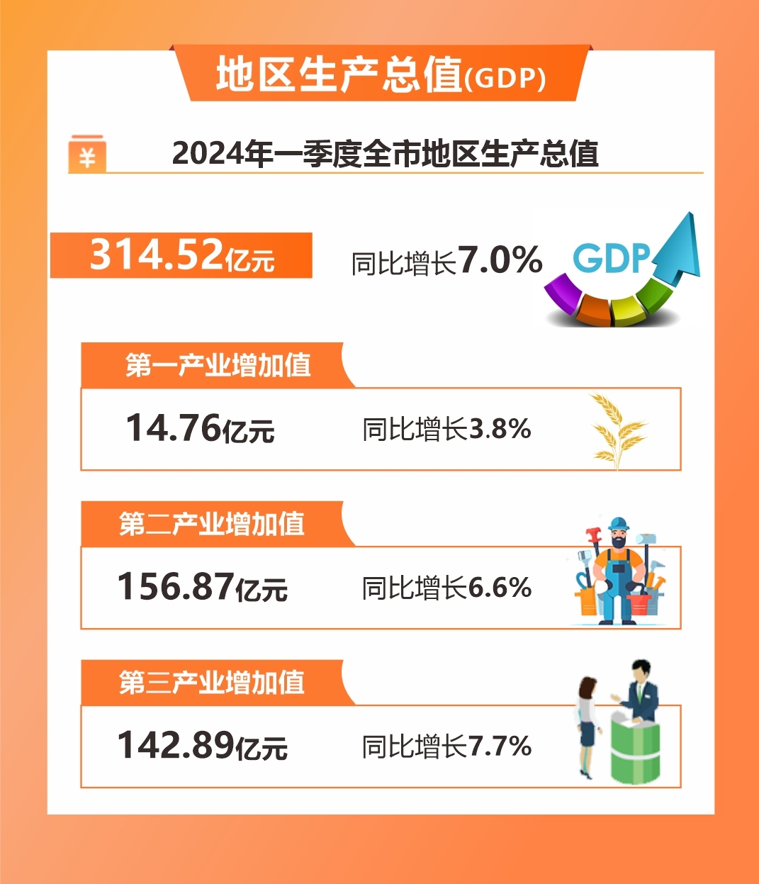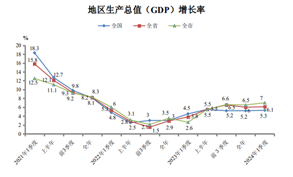 根據地區生產總值統一核算結果,2024年一季度全市地區生產總值314.52億元,按可比價格計算,同比增長7.0%,增速分別高于全國(5.3%)、全省(6.1%)1.7個、0.9個百分點。其中,第一產業增加值14.76億元,同比增長3.8%,增速分別高于全國(3.3%)、全省(2.7%)0.5個、1.1個百分點;第二產業增加值156.87億元,同比增長6.6%,增速分別高于全國(6.0%)、全省(6.4%)0.6個、0.2個百分點;第三產業增加值142.89億元,同比增長7.7%,增速分別高于全國(5.0%)、全省(6.4%)2.7個、1.3個百分點。