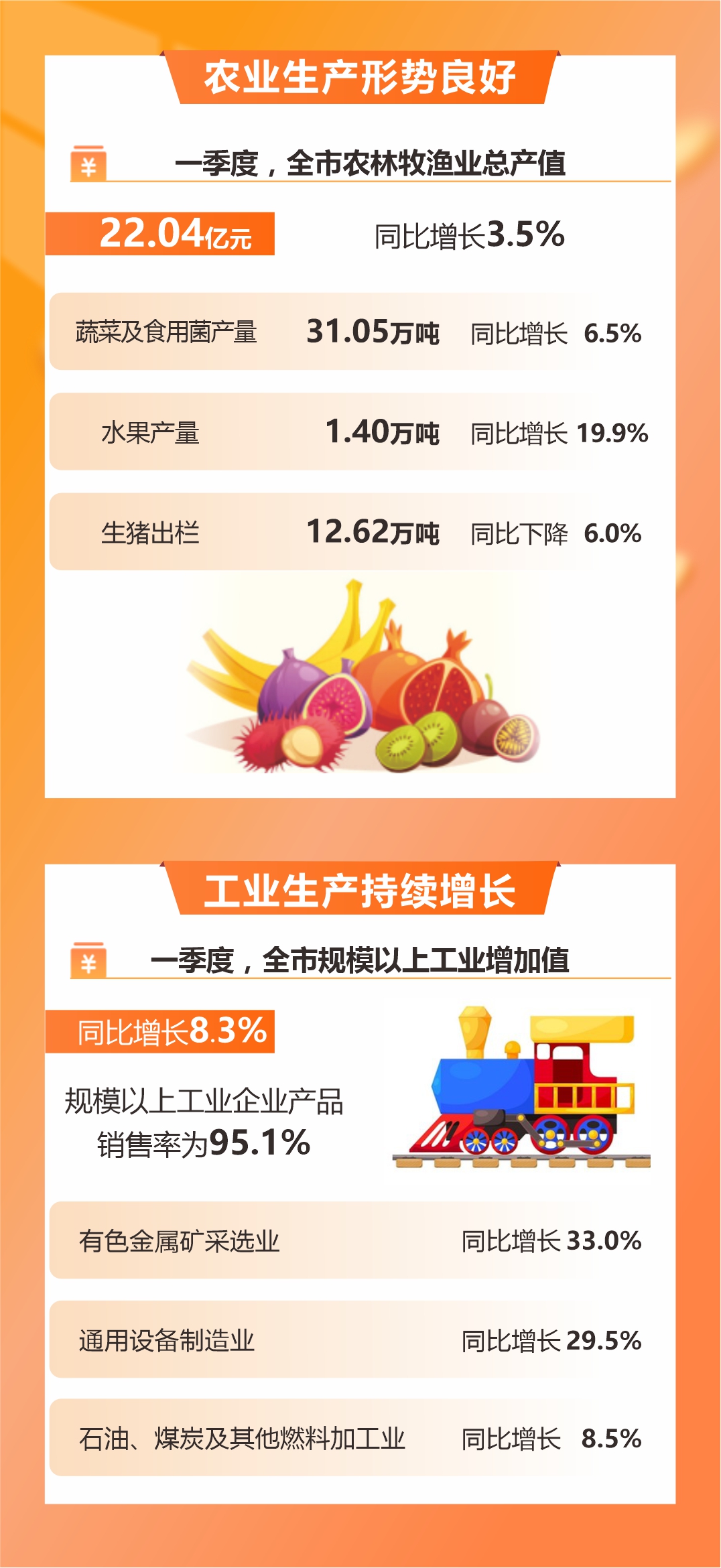 一季度,全市農林牧漁業總產值22.04億元,同比增長3.5%。其中:蔬菜及食用菌產量31.05萬噸,同比增長6.5%;水果產量1.40萬噸,同比增長19.9%。生豬出欄12.62萬頭,同比下降6.0%。