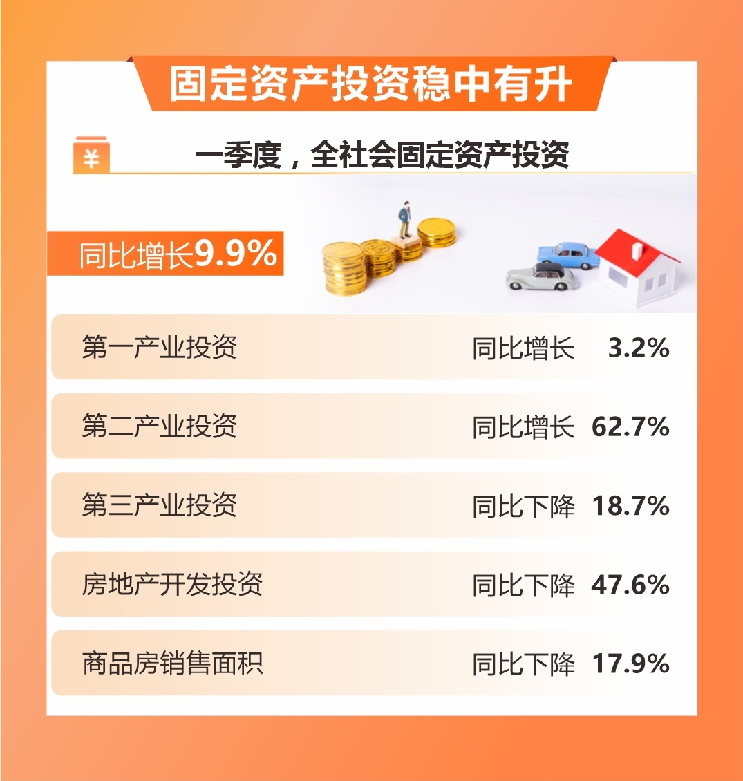 一季度,全社會固定資產投資同比增長9.9%,分別高于全國(4.5%)、全省(5.2%)5.4個、4.7個百分點。