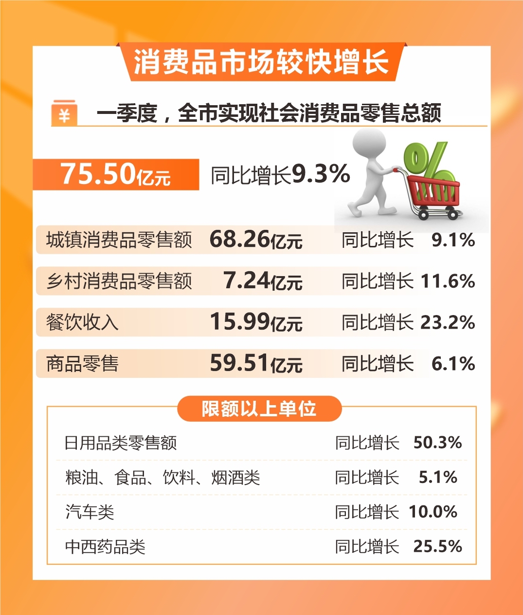 一季度,全市實現社會消費品零售總額75.50億元,同比增長9.3%,增速分別高于全國(4.7%)、全省(6.1%)4.6個、3.2個百分點。