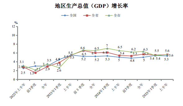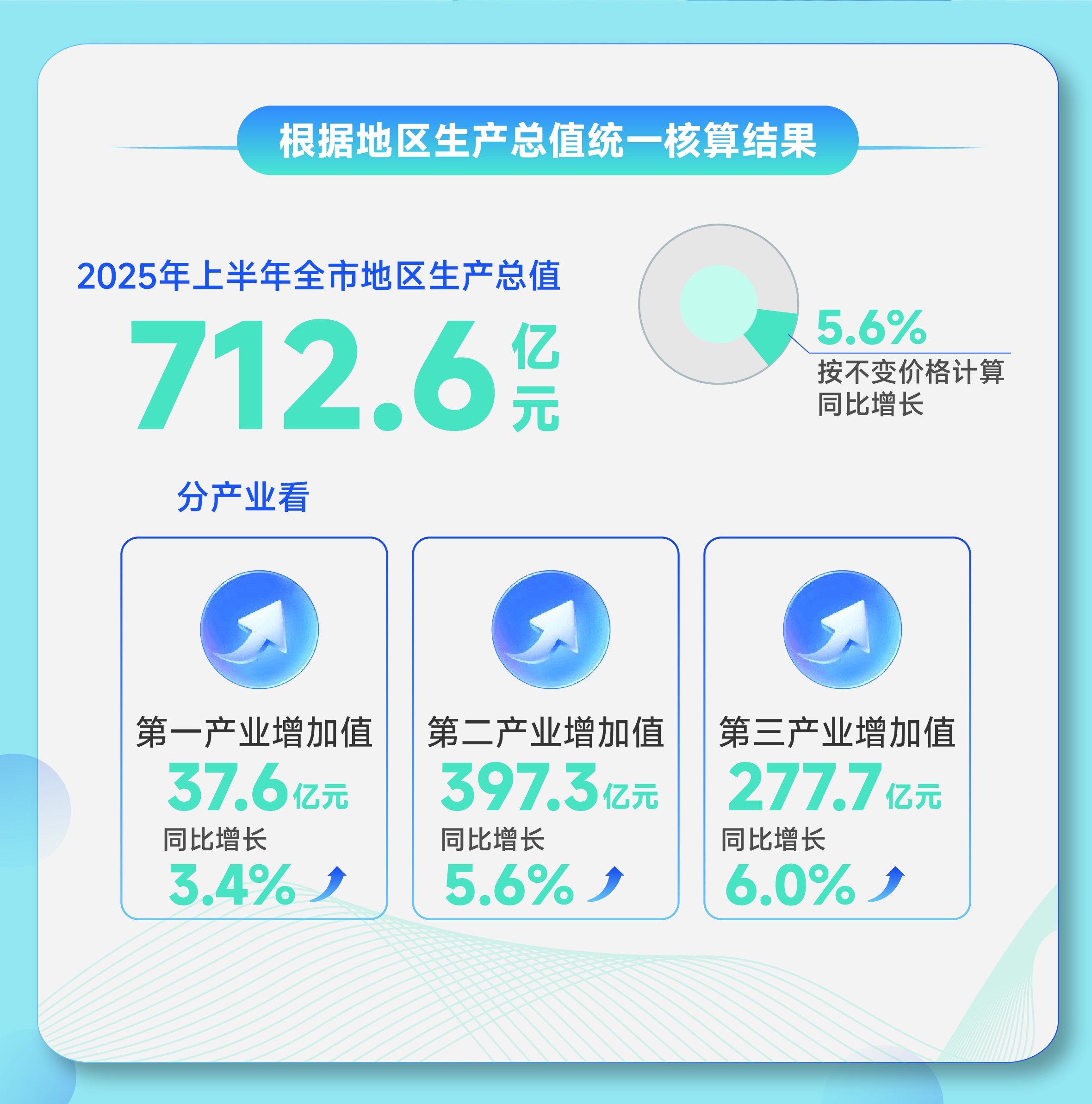 根據地區生產總值統一核算結果,2025年上半年全市地區生產總值為712.6億元,按不變價格計算,同比增長5.6%,增速高于全國(5.3%)0.3個百分點、與全省(5.6%)持平。分產業看,第一產業增加值37.6億元,同比增長3.4%,增速低于全國(3.7%)0.3個百分點、高于全省(3.2%)0.2個百分點;第二產業增加值397.3億元,同比增長5.6%,增速分別高于全國(5.3%)、全省(5.3%)0.3個、0.3個百分點;第三產業增加值277.7億元,同比增長6.0%,增速高于全國(5.5%)0.5個百分點、與全省(6.0%)持平。