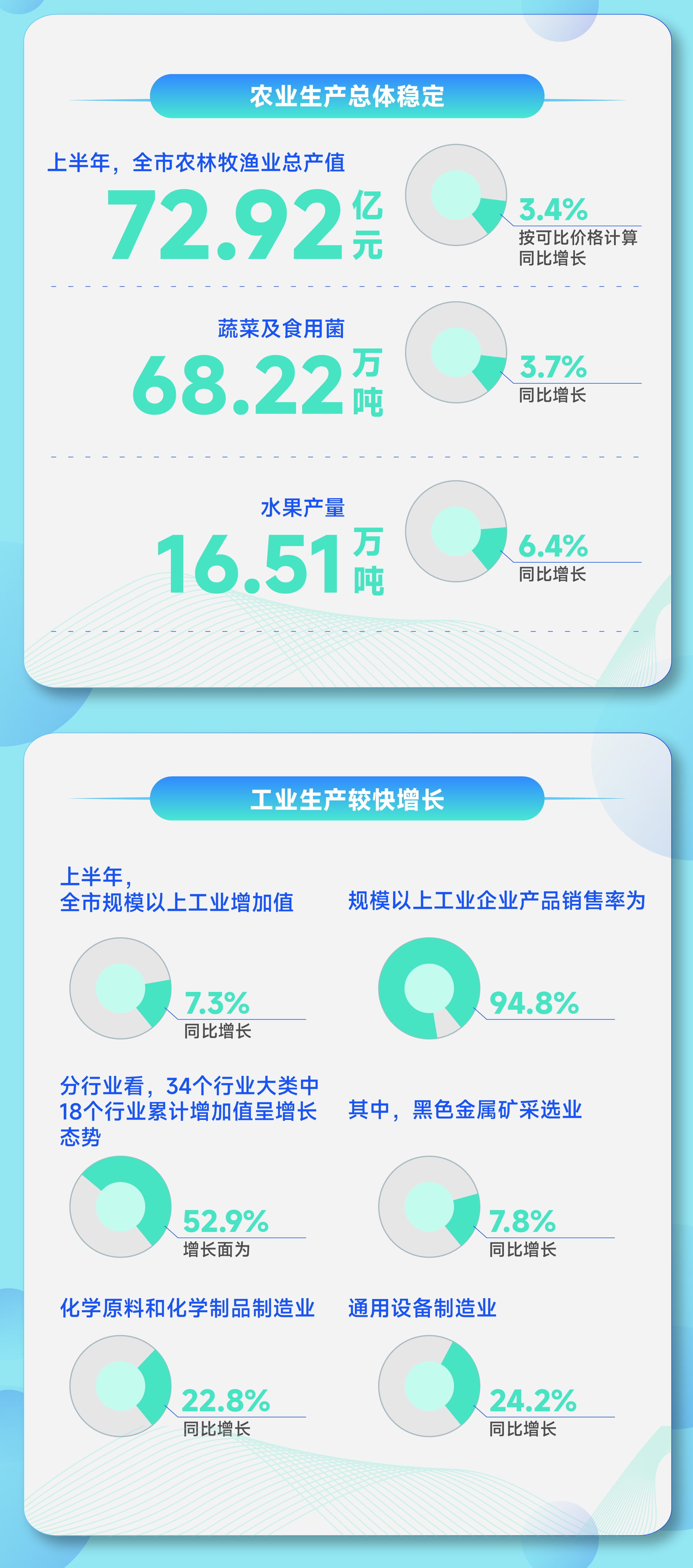 上半年,全市規模以上工業增加值同比增長7.3%,增速高于全國(6.4%)0.9個百分點、與全省(7.3%)持平。