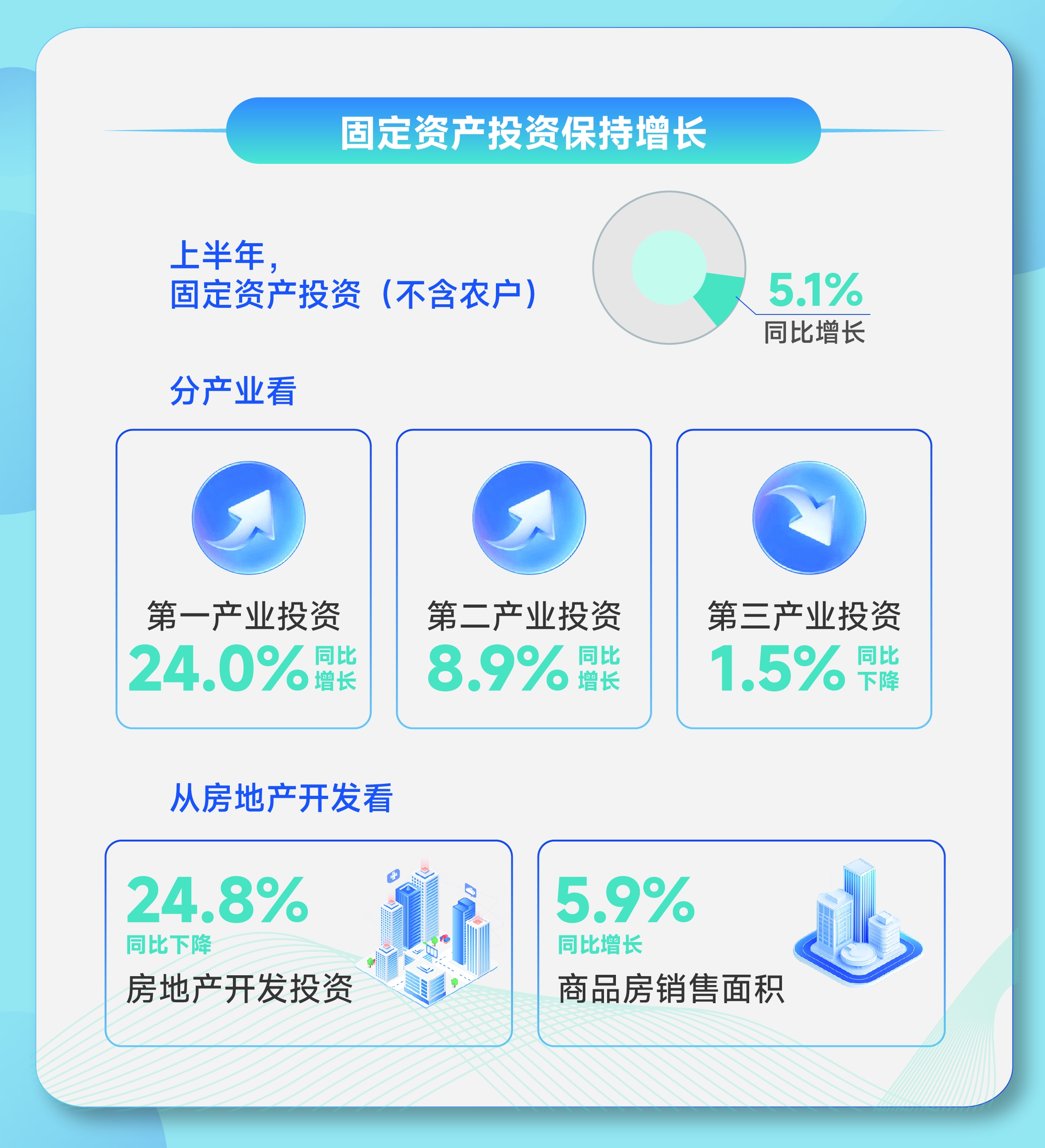 上半年,固定資產投資(不含農戶)同比增長5.1%,增速分別高于全國(2.8%)、全省(2.7%)2.3個、2.4個百分點。