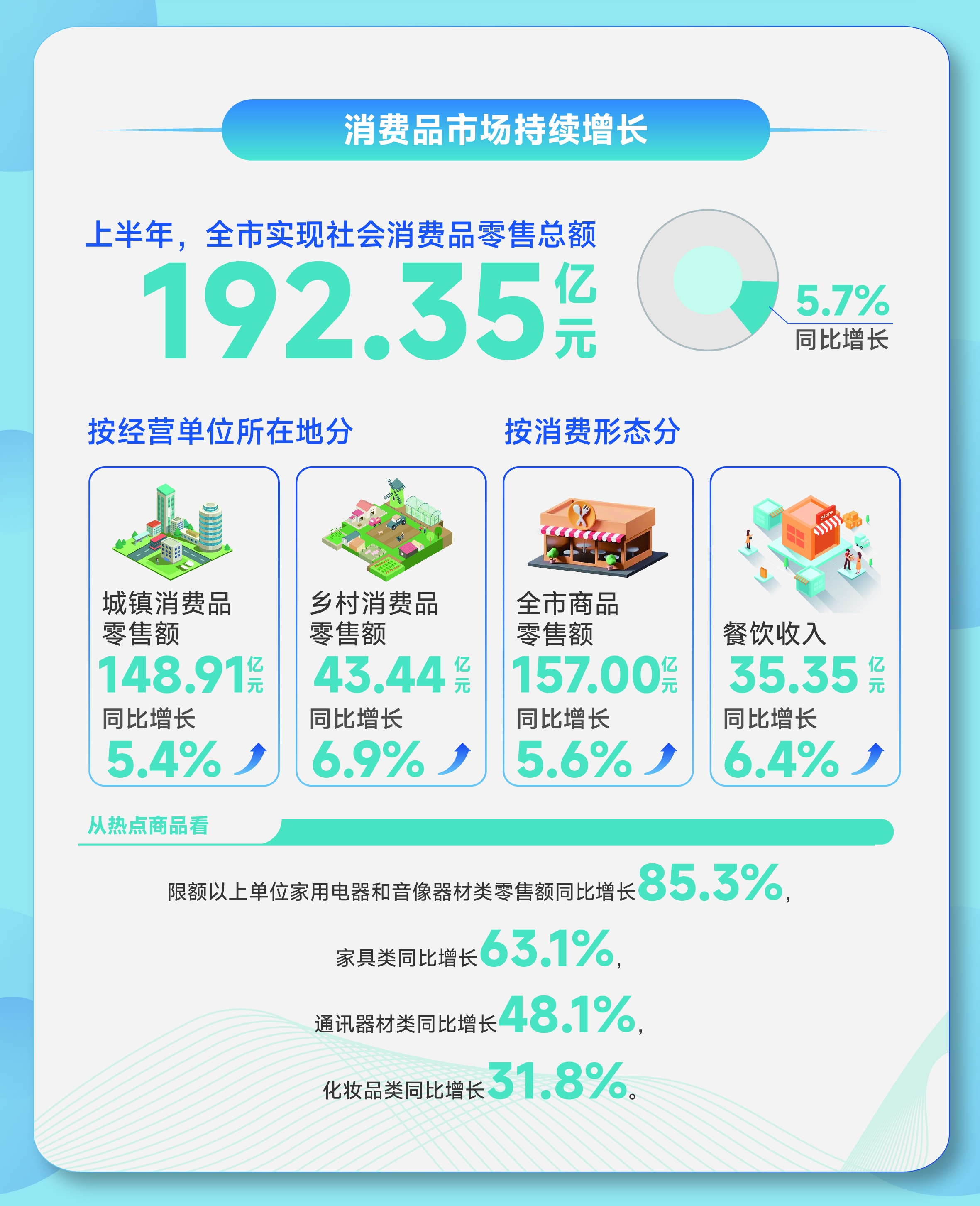 上半年,全市實現社會消費品零售總額192.35億元,同比增長5.7%,增速分別高于全國(5.0%)、全省(5.6%)0.7個、0.1個百分點。