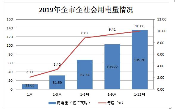 (一)增幅提高,速度高于全省平均水平。2019年,全市全社會用電量135.28億千瓦時,同比增長10.0%,增速比2018年提高2.83個百分點,全年呈現低開高走逐季加快態勢。